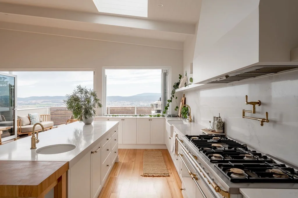 Two years and several countries toured later, Lauren and Kiran’s home - Casa Blanca - is complete, and it’s not difficult to recognise the part of the world from which those influences came. A largely white palette with timber and terracotta accents was inspired by the couple’s time in Europe, with special nods to Spain and Italy. Lauren’s long interest in design was put to work, with a number of selections sourced from overseas to create a sense of the Mediterranean just 10 minutes out of Launceston. International imports include a classic brass Lacanche oven from France, and handmade Moroccan terracotta tiles that surround a French-made Cheminées Philippe wood heater in the living area.