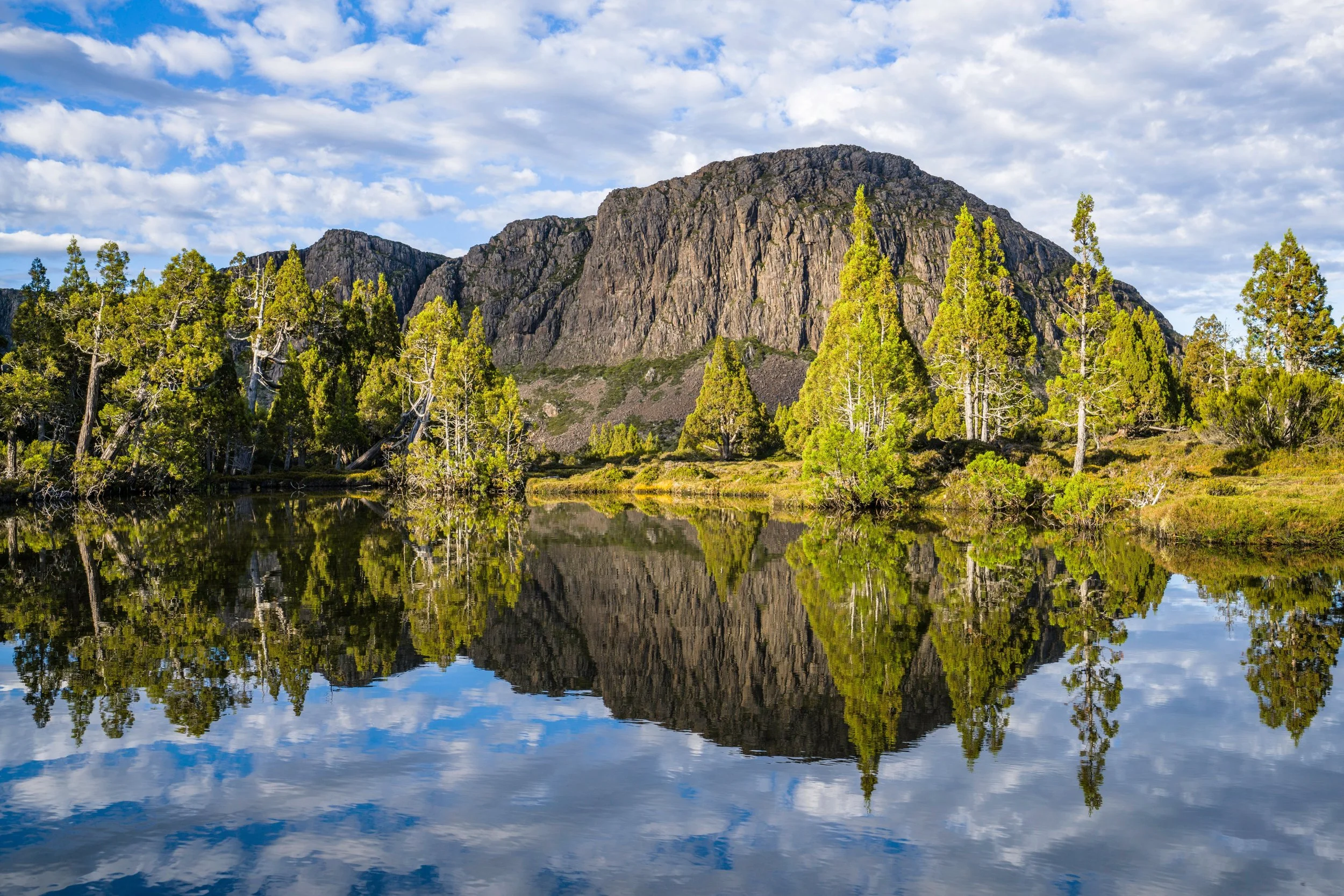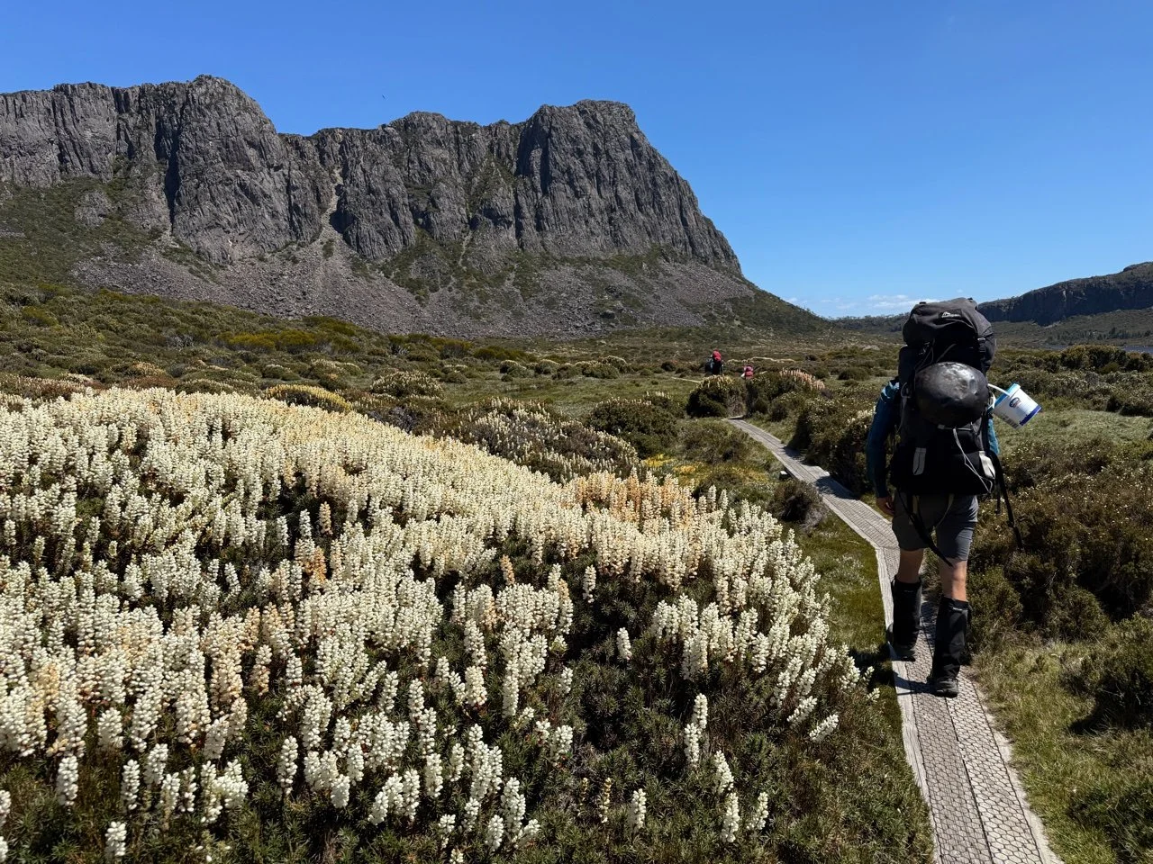 Ahead, the plateau is bursting with wildflowers: yellow daisies, the tiniest blue sky lilies, and creamy-pink scoparia spikes. It’s a spectacular show, a carnival of sumptuous colour. The track winds through a labyrinth of alpine lakes, pencil pines, and towering dolerite cliffs. It feels like we are walking in a secret garden, or inside a wild city.