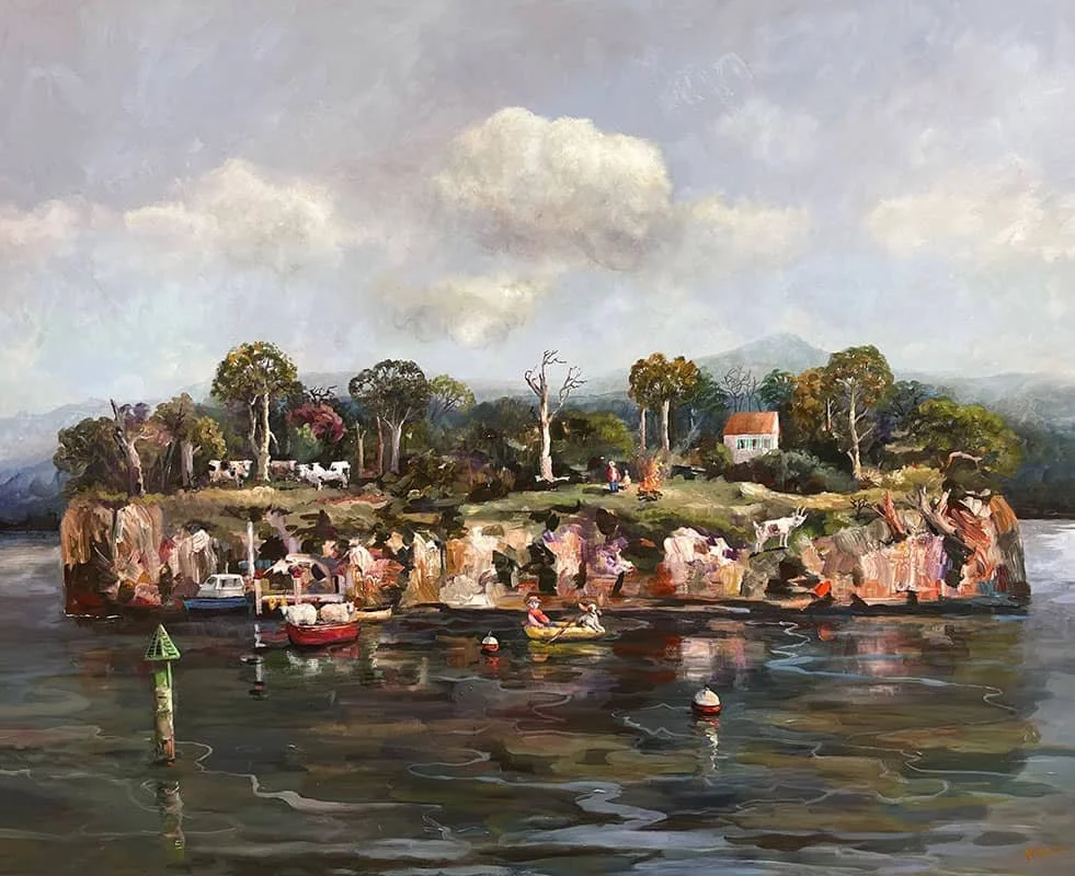 Her latest paintings invite the viewer to embark on an adventure across lutruwita/Tasmania. There’s a gaggle of Gatsby-ish animals enjoying a game of tennis, a lone bride and her sheep, rowboat island races, and domestic scenes with ostensibly rabbit-headed protagonists.