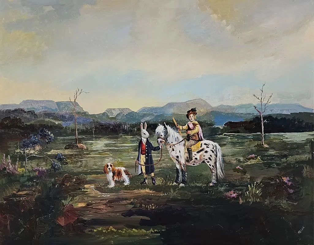 Across densely painted tableaux, Melissa cajoles a cast of well-dressed, anthropomorphised animals into scenes of charming excess. Her work dances on the shoulders of George Stubbs and the Australian Moderns, with complex social scenes playing out across the theatre of the Tasmanian landscape.